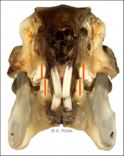 Abb. 3: Korrekt ausgebildetes Gebiss eines Kaninchens von vorn: die Mittellinien der Backenzahnreihe (orange) zeigen, dass die Mahlzähne bei geschlossenem Kiefer nicht direkt übereinander stehen, aus Rühle (2017)
