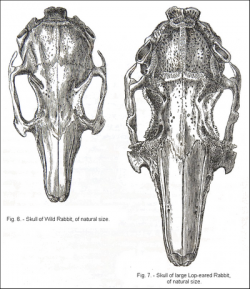 Abb. 1: Schädel eines Wildkaninchens (links) und eines großen, hängeohrigen Kaninchens (rechts); aus Darwin, C. (1868)