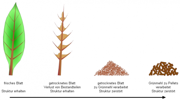 In kommerziellen Futtermitteln wie pellets wurden die Basisbestandteile zu Grünmehl verarbeitet und anschließend durch extrusion zu Stangen gepresst, die schließlich auf Länge geschnitten werden. Abbildung 1 zeigt die Zerstörung der Struktur von Futterbestandteilen durch Verarbeitungsprozesse wie das Mahlen. Die Festigkeit der Pellets suggeriert eine Struktur, die tatsächlich nicht gegeben ist. Das Kaninchen muss solche Futtermittel nur wenig kauen, was eine geringere Einspeichelung der Nahrung zur Folge hat.