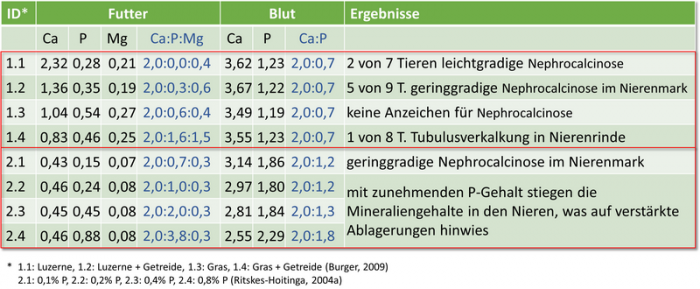 Abb. 9: Vergleich von Werten für Mineralien und ihrem Verhältnis zueinander (Basis Ca = 2,0) in Futtermitteln (in %) und im Blutplasma (in mmol/l), 1. aus Burger, 2009, 2. aus Ritskes-Hoitinga et al., 2004