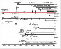 Abb. 1: Beziehungen zwischen einigen Inzuchtstämmen von Kaninchen am Jackson Laboratory (JAX), aus Festing, 1979. Rot gekennzeichnet der Inzuchtstamm "III NZW" (New Zealand White)Fox & Crary, 197111) vom JAX verzeichneten eine Zunahme des Merkmals „Mandibular prognathism“ in einer Variante der ursprünglichen Inzuchtlinie „III“ von Weißen Neuseeländern mit der Bezeichnung „IIIc“ und untersuchten dieses Phänomen. Bis dahin traten Fälle von Prognathismus in der Kolonie des JAX nur sporadisch auf. Resultierend aus den Versuchen wurden für die Zunahme, neben der Inzucht, folgende, mögliche Ursachen genannt: