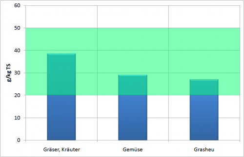 Abbildung 1 gibt Rohfettgehalte in g/kg Trockensubstanz verschiedener Futtermittel wieder. Der grüne Bereich zeigt den empfohlenen Gehalt an.3)