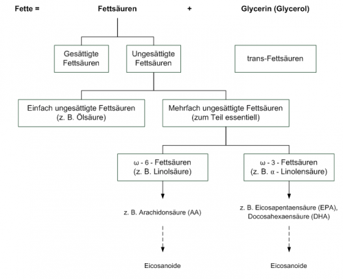 Alle Tiere wie auch der Mensch haben die Fähigkeit verloren, aus der einfach ungesättigten „Ölsäure“ die mehrfach ungesättigten Fettsäuren Linolsäure und α-Linolensäure zu synthetisieren. Sie müssen also zwingend mit der Nahrung zugeführt werden. Aus diesen können dann langkettige, mehrfach ungesättigte Fettsäuren wie AA und EPA durch eine Reihe von Desaturierungs- und Elongationsreaktionen synthetisiert werden4).