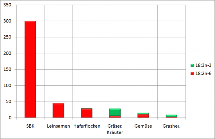 Als gute Fettsäurelieferanten werden oft ölhaltige Samen angesehen. In Abbildung 4 sind, zusätzlich zu Wiese, Gemüse und Heu die Gehalte an PUFA in Sonnenblumenkernen (SBK), Leinsamen und Hafer aufgeführt.