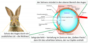 Wie bereits erwähnt, bildet die Stelle des schärfsten Sehens und der höchsten Farbempfindlichkeit bei Menschen und einigen Primaten die „Sehgrube“ (Fovea centralis), eine Einsenkung im Zenrum des „Gelben Flecks“. Kaninchen fehlt diese Fovea11). Sie folgen Bewegungen von Objekten nicht unbedingt mit den Augen, auf die sie auch nicht „scharfstellen“ können, sondern erfassen ein „Gesamtnetzhautbild“, in dem Bewegungen z. B. als Gefahr wahrgenommen werden. Zudem helfen bewegungsempfindlicher Nervenzellen in den Randbereichen der Netzhaut bei der Erkennung kleinster Bewegungen. Nach Hughes, 197112) spielen im Vergleich zur Katze und zum Affen beim Kaninchen eher die Bewegung als die Konturextraktion die Hauptrolle bei der Unterscheidung von Figur und Hintergrund. Die „hyperkomplexen“ Eigenschaften einiger Einheiten im Kaninchenkortex stellen sicher, dass sie das Vorhandensein von sich bewegenden Reizen nur innerhalb eines bestimmten Winkelgrößenbereichs und einer bestimmten Region des visuellen Raums signalisieren.