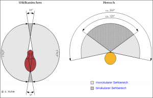 Abb. 9: Sehfeld des Wildkaninchens; nach Leicht, 1979 im Vergleich zum MenschenDas binokulare Sehen, also die Tiefenwahrnehmung und somit ein räumliches, stereoskopisches Sehen, ist beim Kaninchen sehr eingeschränkt, weil die Augen seitlich am Schädel sitzen. Nur nach vorn, oben und hinten in einem relativ nahen Bereich kann jeweils ein Bild dreidimensional erfasst werden.