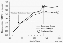 Abb. 1: Knochendichte kastrierter Kaninchen mit und ohne zusätzlicher Testosterongabe, nach Gilsanz, et al., 1988Gilsanz, et al., 19882) untersuchten den Einfluss der Geschlechtshormone auf die Knochendichte. Nach der Kastration im Alter von 6 Wochen wurden männlichen Weißen Neuseeländer-Kaninchen jeweils Testosteron und Östrogen verabreicht, also die Geschlechtshormone, die nach einer Kastration nicht mehr produziert werden. Die Knochendichte wurde mit Hilfe Quantitativer Computertomographie (QCT) ermittelt und die Werte als K₂HPO₄ (Dikaliumhydrogenphosphat) in mg/cm³ angegeben. Aus den folgendenen Diagrammen wird ersichtlich, dass die Knochendichte der Kontrollgruppe, also die der kastrierten Tiere ohne Testosteronzugabe zum Zeitpunkt des Schlusses der Wachstumsfugen signifikant geringer war als die Knochendichte der Tiere, die zusätzlich Testosteron erhielten. Ein ähnliches Ergebnis erbrachte die Zufuhr von Östrogenen.